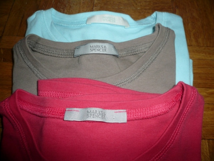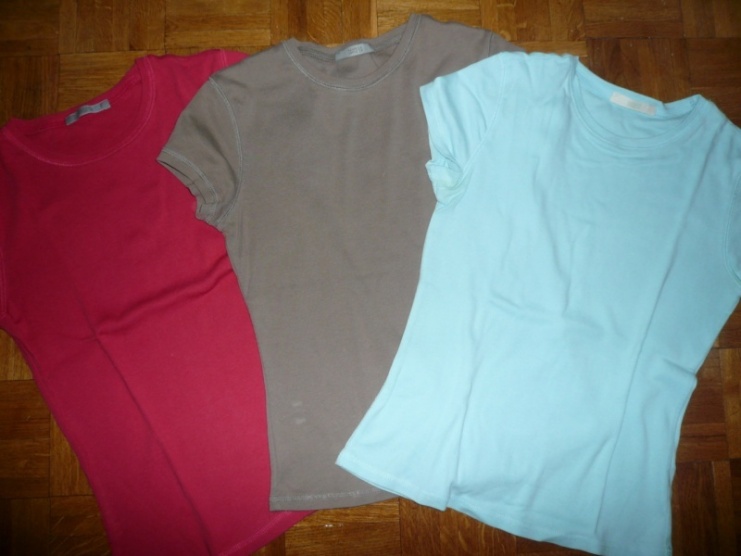Prodám 3 trička: červené, béžovohnědé a světlounce modré - značky Marks and Spencer, velikost S, materiál 100% bavlna.