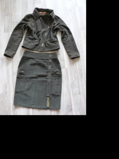 0Téměř nenošená souprava sukně i sako asymetrického stylu v barvě tmavé khaky, téměř nenošené..