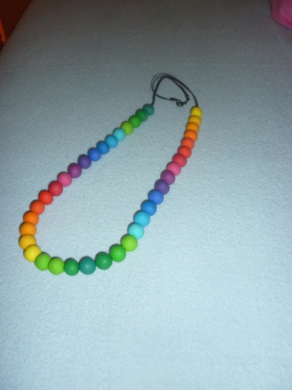 Prodám tyto krásné korále v barvě duhy. Jsou vyrobeny z fima a pověšeny na šňůrce. Cena 70Kč, případně vyměním.