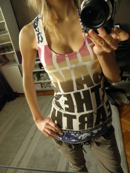 Prodám bílý nátělník s barevnými nápisy, párkrát nošený.. Už jsem ho tu jednou od slečny koupila, ale neunosím ho.. Prodám za 200kč plus pošta