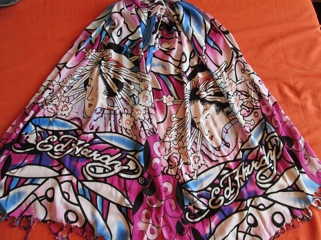 Prodám pestrobarevný šátek Ed Hardy, rozměry 100 x 200 cm. Vzatý párkrát.