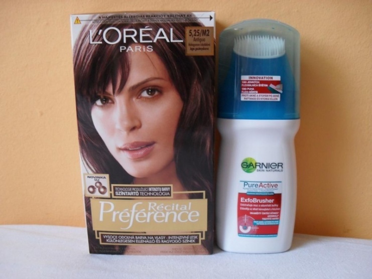 Jedná se o novou barvu na vlasy od L´ORÉAL PARIS : 5,25/M2 - Antigua, Mahagonovo čokoládová, s technologií prodlužující intenzitu barvy, dále ExfoBrusher od GARNIER skin naturals - obsahuje Kyselinu Salycilovou + HerbaRepair, odstraňuje maz a odumřelé buňky, proti akné a stopám po akné.