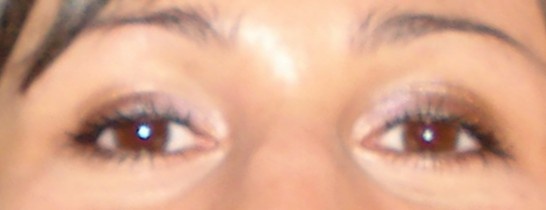 Na fotce ružovo-fialové (jediný odstín fialové co mi zatím sedl - Maybelline Cool Efect odstín SIlver Lilas), tmavě hnědá linka na vnějším horním víčku, černá řasenka - to už je pro mě večerní líčení (přes den bych takhle nevyrazila)