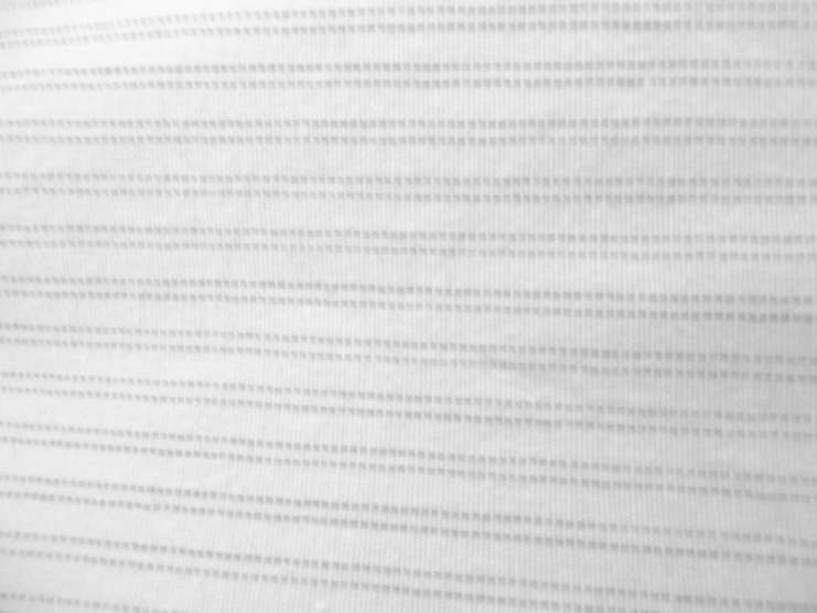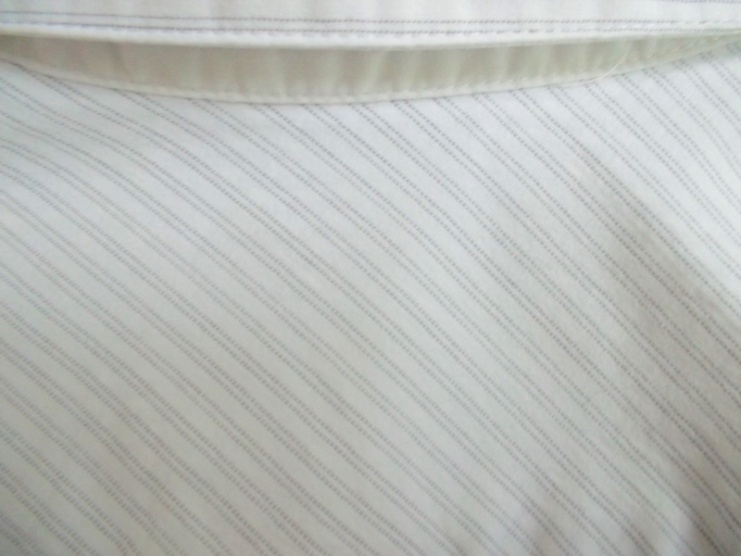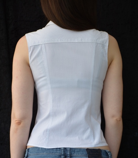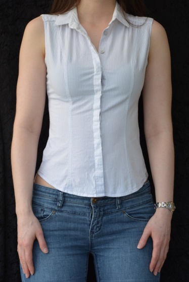 Materiál bavlna a elastan, bílá s drobným tmavým proužkem. Oficiální velikost XS, ale doporučila bych ji i jako XXS (prsa 76-77 cm, pas 66 cm). Vhodná na menší postavu, cca do 165 cm. Délka vzadu 51 cm, vepředu 58 cm.