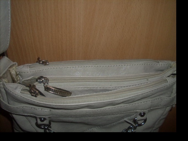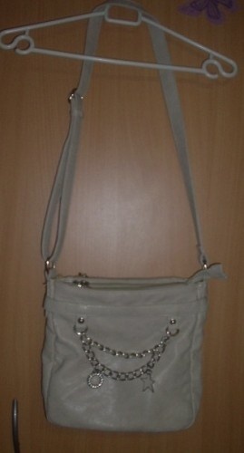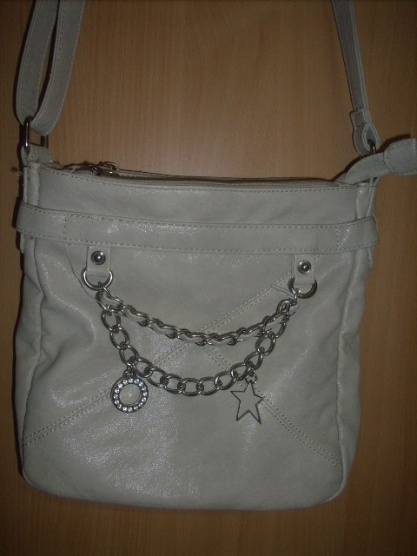 Béžová/nude crossbody kabelka. Má tři velké kapsy, uvnitř prostřední je menší, taktéž na zip. Na přední kapse jsou moderní řetízky. Jeden je proplétaný - materiálem, ze kterého je vyrobena i kabelka. Jako ozdoby jsou na řetízku písmenko O a hvězdička.