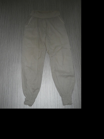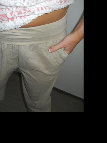 Světlounké, lehounké harémové kalhoty. Jsou velmi pohodlné a přizpůsobivé, ale mě bohužel velké=o( měla sem je na sobě tak dvakrát. Rozměry: délka 96cm, pas v klidu 34cm- dá se natáhnout.