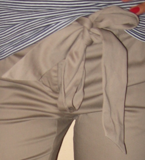 Místo pásku je u kalhot mašle, která se dá ale vytáhnout.