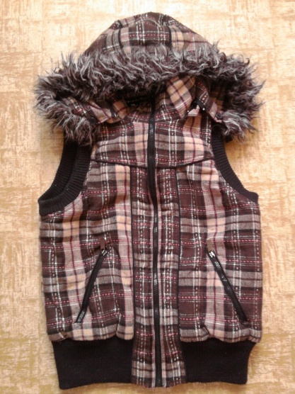Prodám teplejší vestičku. Barva béžovo-hnědá, prošívaná růžovou a stříbrnou nitkou. Kapuce se dá stáhnout, kolem moderní kožíšek. 1x vzatá na sebe. Cena 300+ poštovné