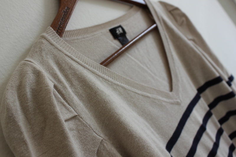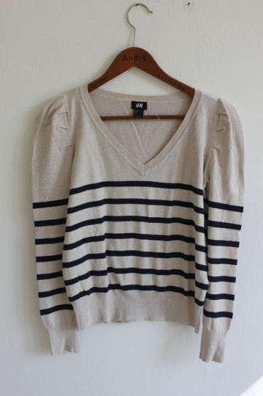 2Krásný krémový svetřík s tmavěmodrými pruhy z H&M, nabírané rukávy, příjemný materiál.
