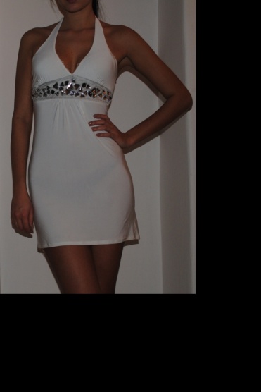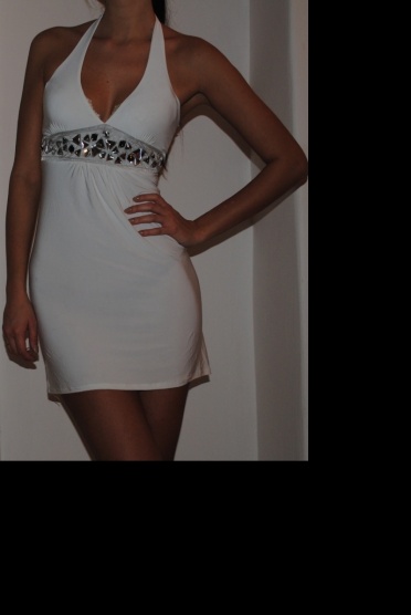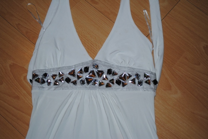 Šaty boli použité raz inak mi bohužial stoja v skrini. Chrbát holý. Ľahká látka, V výstrih, kamienky