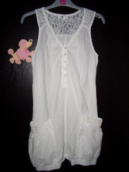 bílá Amisu s krajkovou vsadkou na zádíčkách a na kapsách, je značena XS, ale sedí až na Mko, mně je těsná přes prsa a rozepnutá se mi až tak na mně nelíbí, jednou praná. Délka 79cm, v průramku 43cm.199 vč. pojištěné pošty