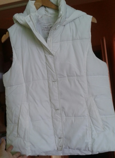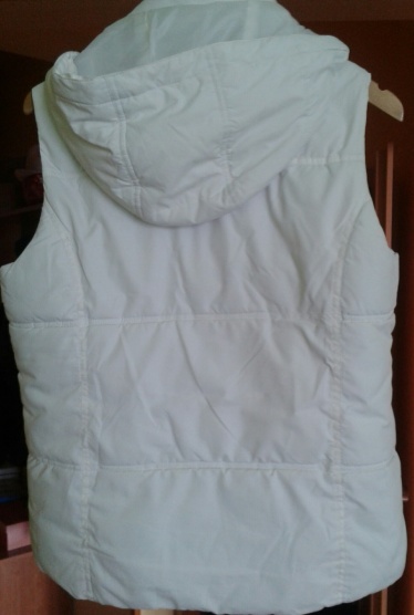Bílá vesta s kapucí, plněna mikrovláknem, nošená, ale ve velmi dobrém stavu. Kapuca naní odnímatelná, zapínání na zip. Velikost 40. Poštovné 50Kč.