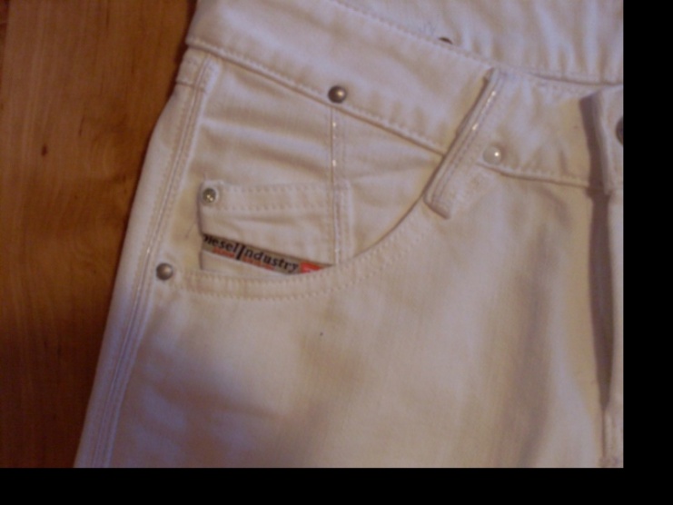 Na pravé přední kapsičce logo Diesel a kamínkový druk, po stranách nohavic a v poutkách na pásek lesklý bílý proužek, na zadních kapsách stříbrné ohraničení zipů a klasická Diesel placka.