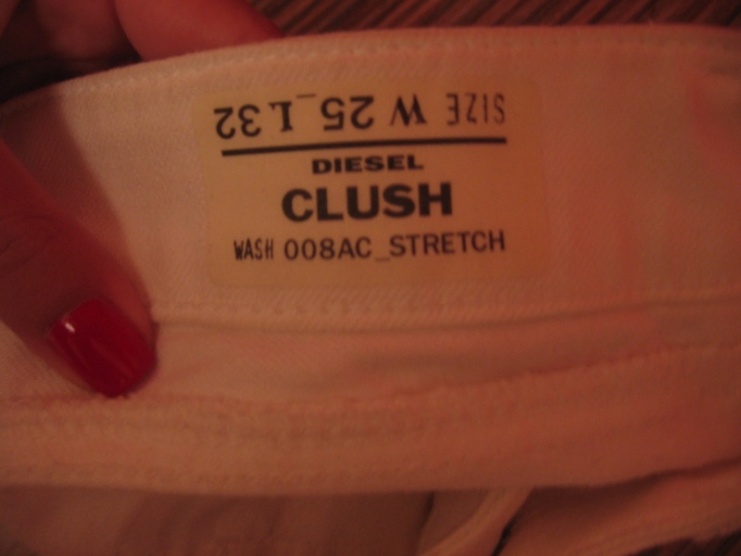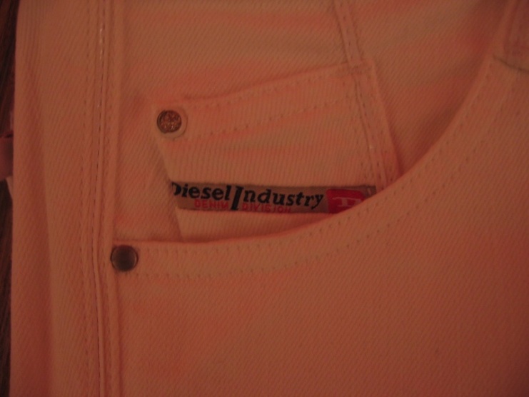 Na pravé přední kapsičce logo Diesel a kamínkový druk, po stranách nohavic a v poutkách na pásek lesklý bílý proužek, na zadních kapsách stříbrné ohraničení zipů a klasická Diesel placka.