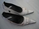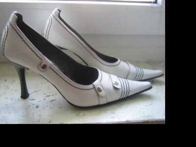 Prodám bílé kožené lodičky na 8,5 cm vysokém podpatku, zdobeny černým štepováním a cvočky. Jsou mírně nošené, ale v bezvadném stavu. Určeny spíše na uzší nožku, velice elegantní. Cena 350 Kč včetně poštovného.
