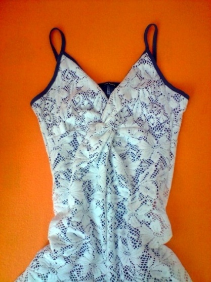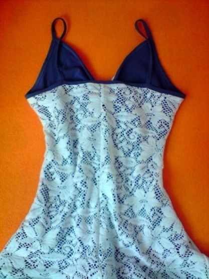 Barva: bílá s blankytně modrou podšívkou po celé délce šatů