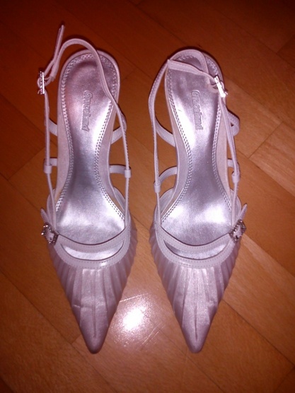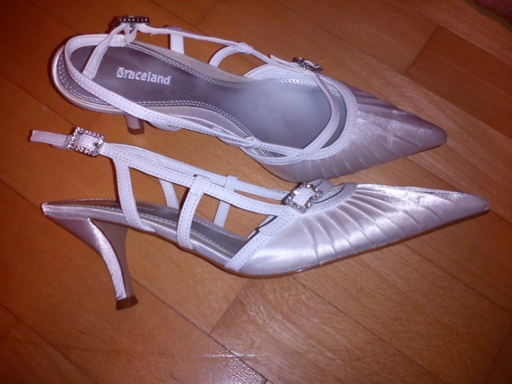 Nabízím bílé saténové lodičky zn. Graceland - Deichman. Velikost 38, délka stélky cca 24,5 - 24,8 cm, podpatek až k patě měří 6,5 cm, jsou nizoučké, pohodlné. Opravdu krásné, ale unáhlila jsem se při koupi. Měla jsem je na sobě 2x - poprvé při zkoušení v obchodě a podruhé jsem v nich chvíli chodila doma. Podrážka a podpatek tedy ani trošku neochozené. Levá špička trošku zašpiněná, ale není to skoro vidět. To je z toho jak jsem se stále přemísťovala. PC 549,- Kč. Nabízím za 350,- Kč včetně poštovného.