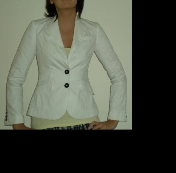 Prodám bílé sako Mango, na struktuře jsou drobné svislé proužky, viditelné jen zblízka. Kvalitně šité, barva knoflíků tm. modrá až černá (2 knoflíky vepředu a 5 na každém rukávu). Vhodné do práce i jako námořnický styl. Na fotce bohužel trochu pokrčené a ne ideální na moji postavu (je mi krátké a úzké v ramenou). Na postavu do výšky 178cm. Cena jen 400 plus pošta.