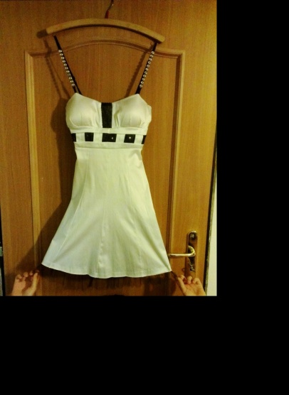 Nošené minimálně, velikost 36/S. Mezi prsy a pod prsy jsou zdobeny černými flitry, ramínka zdobená stříbrnými kolečky, dají se posouvat, jako u podprsenky. Zapínání na zip na zádech. Na spodu sukně je "krajka" ze šifonu.
