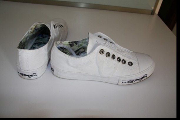 Prodám 2x obuté tenisky ed hardy,vůbec je neunosím,jelikož nejsem tenisková.Jsou z usa značeny velikostí 6,což odpovídá 37,ale já mám 36 a jsou mi.Stélka je 23cm.Lehounlince ušpiněné.