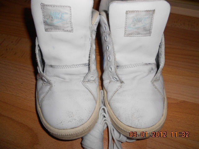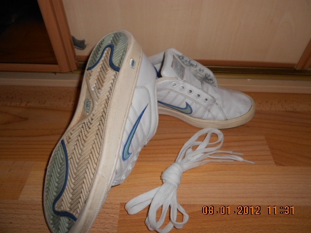 Prodám nošené tenisky Nike, barva bílá s modrou fajfkou a detaily. Tenisky mají známky nošení viz foto (lehce odřené špičky a dovnitř by bylo dobré dát si novou vložku). Jinak podrážky jsou naprosto v pořádku, nikde se nepárají ani nerozpadávají. Botky jsem vyprala a dávám k nim nové tkaničky