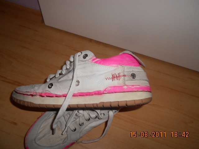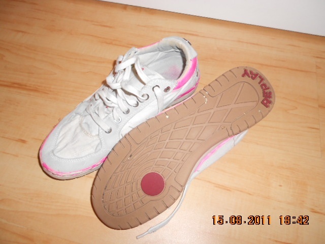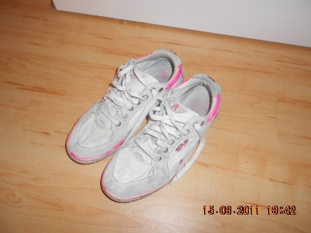 Krásné bílé tenisky Replay! Chvíli nošené, ale nemají žádnou vadu! Used styl! Velikost je uvedena 41, ale v pohodě může i ten kdo nosí 40 (já běžně nosím 40 a v pohodě jsem je nosila). Zdobené růžovou, vypadá to jako by ta růžová byla namalovaná fixou, moc originální vzhled! Moje cena je 899,- vc. pošty