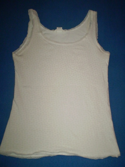 Bílé tílko olemované krajkami. Měla jsem ho párkrát na sobě, protože jsem mám moc těsné a to já nemám moc ráda. Na tílku jsou malé kolečka viz detail. Pište pro případné dotazy.