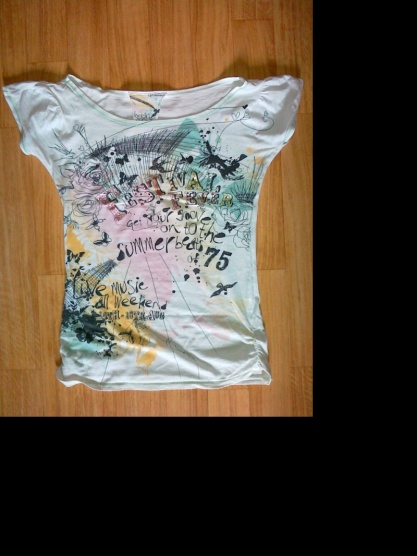 Prodám bílé tričko s barevným zdobením na prsou. Vzaté maximálně třikrát. Má hezký kulatý výstřih.