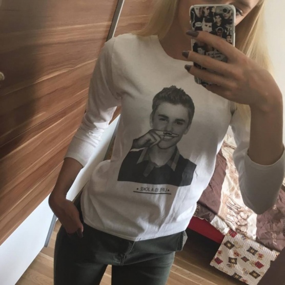 Bílé tričko Justin Bieber vel. XS - Jednou vzaté, bez závad, potisk zpěvák Justin Bieber, sedne i na S (36)