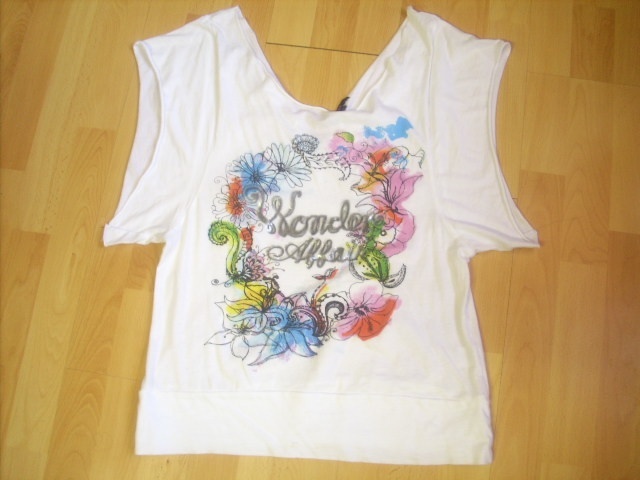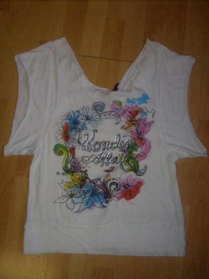 Bílé tričko s barevným potiskem, je volnějšího střihu. Velikost je uvedena S, ale myslím si, že padne i na M a L. Rukávy jsou stejně široké, nejsou křivě ustřižené