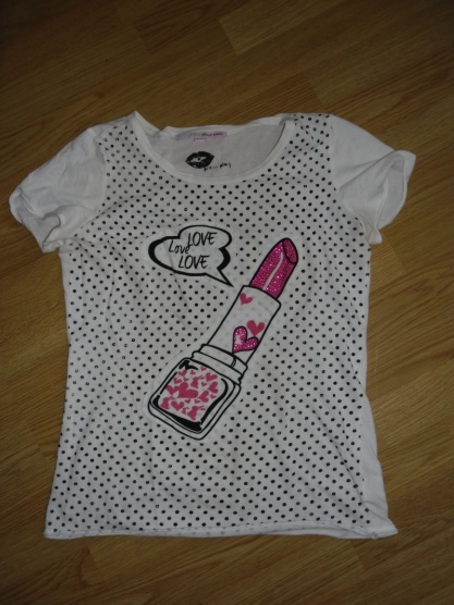 0Prodám tričko Tally Weijl s krátkým rukávem. Bílé s černými puntíky a vyobrazenou rtěnkou, která je posázená růžovými kamínky. Oblečeno asi 3x.