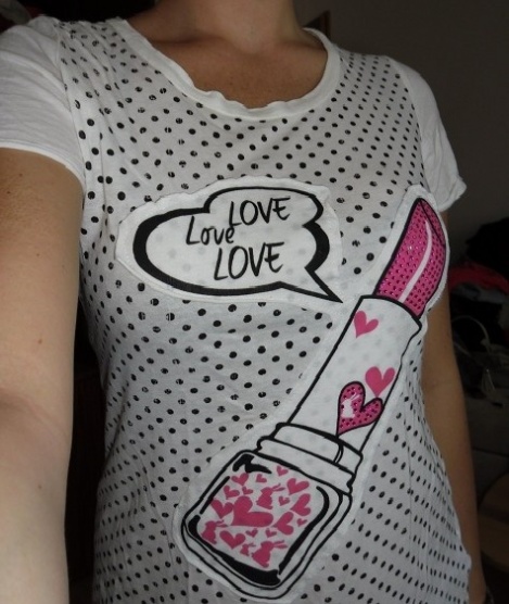 Prodám tričko Tally Weijl s krátkým rukávem. Bílé s černými puntíky a vyobrazenou rtěnkou, která je posázená růžovými kamínky. Oblečeno asi 3x.