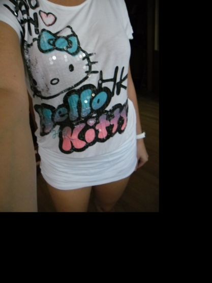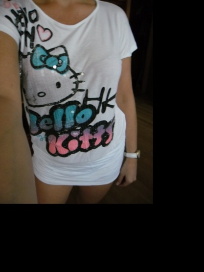 Prodám bílé tričko z dětského H&M. Vel. uvedena 158/164. Já nosím obvykle vel. S, nebo M a mám ho volnější. Vhodné jako tunika, nebo volnější tričko. Velice efektní flitrovaná aplikace (Hello Kitty). Na sluníčku hází prasátka. Flitry jsou pevně přišité a ani jeden nechybí. 100% viskóza.