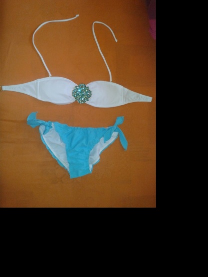 Zcela nové plavky na styl VS s modrou velkou sponou. Rozměry: Podprsenka: 60 cm, když to není natáhlé, nejvíc se mi to podařilo natáhnout na 86cm, výška košíčku 14cm, kalhotky 64cm, když jsou na fest zavázané a nenatáhlé, ale dají se libovolně zavázat. Nejvíc se mi je podařilo natáhnout ( když jsou na fest zavázané na 92 cm. JEN PRODEJ. Děkuji za pochopení