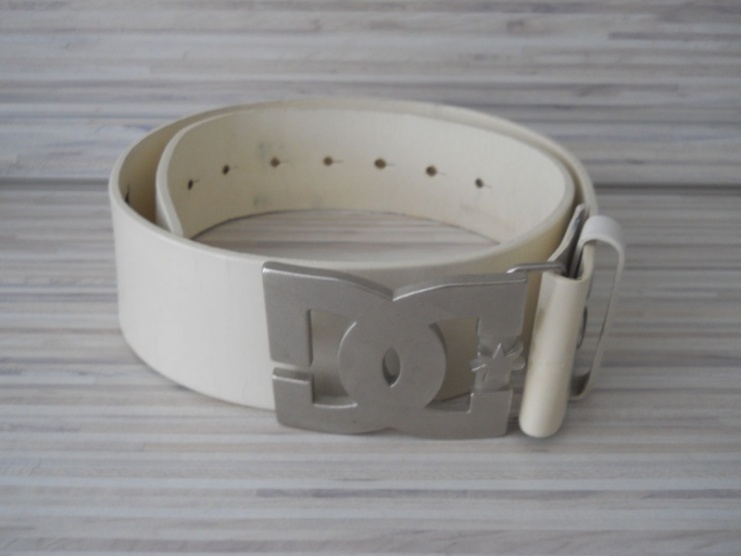 0Nošený pásek bílý pásek DC. Má známky používání, místy popraskaný, ale někdo třeba ještě vynosí. Délka i se sponou je 103cm, šířka 4,5 cm.