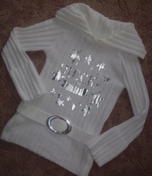 Bílý svetr vhodný na podzim nebo zimu. Stříbrná přeska. Stříbrný potisk "Rock star". Barva: bílá. Na svetru není uvedena velikost, ale odhaduji XS,S. Je pružný.