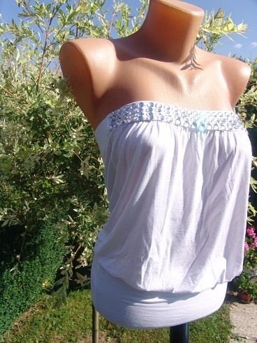 Prodám sněhově bílý topík, zdobený kamínky, velikost udaná M-ko, ale padne i L-ku, pružný poddajný materiál. Mnou nenošený, nevhodně zvolená velikost. Cena 160 Kč včetně pošty