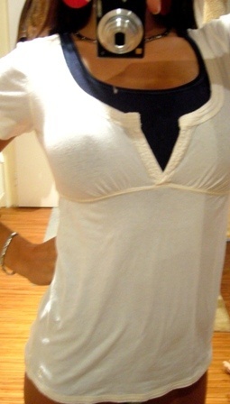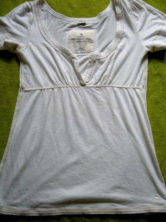 Bílý zajímavě řešený top. Kupovaný v USA, originál. Nošený, ale zachovalý. Prostřežený a nařasený pod prsy, které přidává v požadovaných místech centimetry