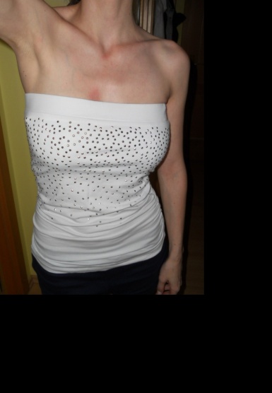 Prodám topík Amisu, nad prsy je všitá guma, která ho drží na těle. Přední díl vykládaný kamínky, zadní bez aplikací.
