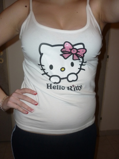 Bílé tričko s obrázkem kočičky Hello Kitty a kamínky, ani jeden nechybí. Na sobě jsem měla asi 3x. Velikost M. Cena 60Kč, případně výměna.