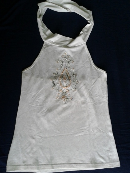 Bílý top na zavazování za krkem s holými zády, je elastické, tudiž se přizpůsobí každé postavě, velikost označena S. Bez vad.