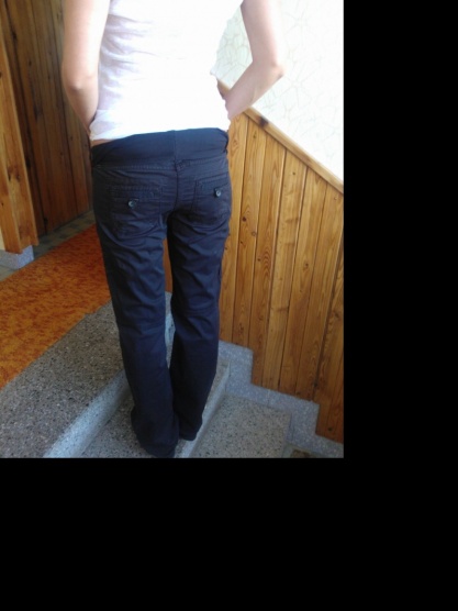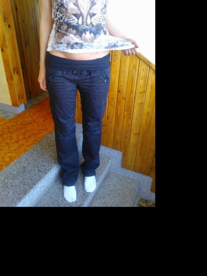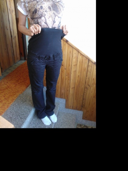 Těhotenské látkové kalhoty černé barvy. Velikost je M i L, ptz jsou volné- nemají pevný šev u pasu. Bavlněná látka přes bříško se dá i srolovat a nosit jako obyčejné kalhoty. Také výborné na chladnější počasí- využití na záda proti ustydnutí.