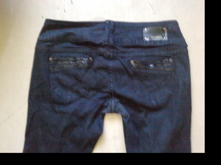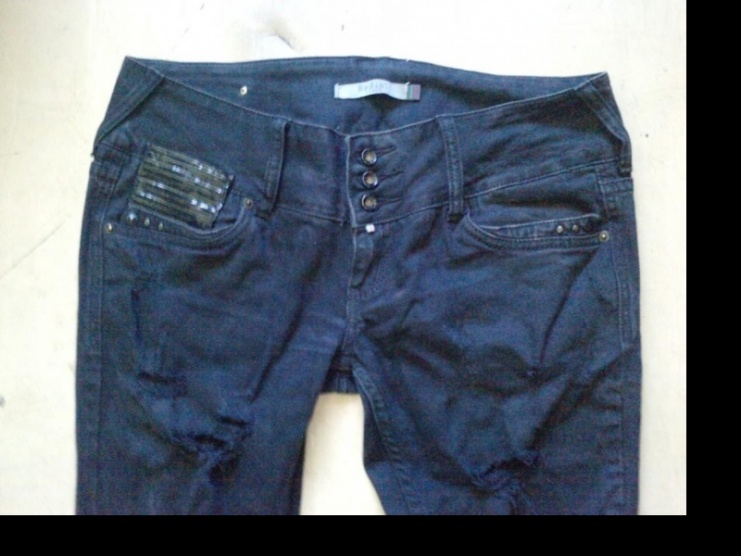 Černé, bokové, mírně trhané džínsy, se širokým pasem a lemováním kolem kapes je černě flitrované. Skvěle padnou, formují postavu. Jsou nové jen jednou vyzkoušené a mě bohužel malé. PC: 800,- nyní 350