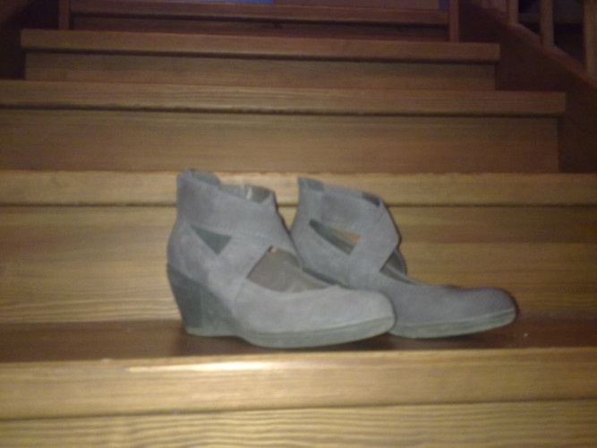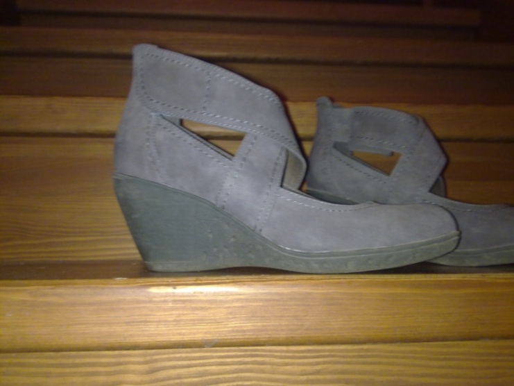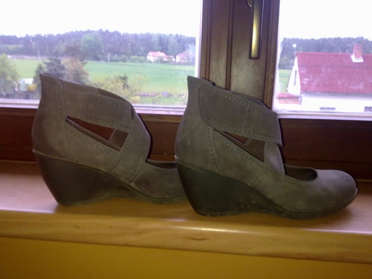 Krásné, šedé boty na klínku se suchým zipem- byla jsem překvapená jak je klínek pohodlný, byly to první boty na klínku ze kterých mě nebolely nohy, bohužel jsem si vzala větší velikost, a teď v nich vypadám jak kocour v botách