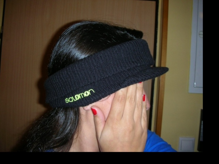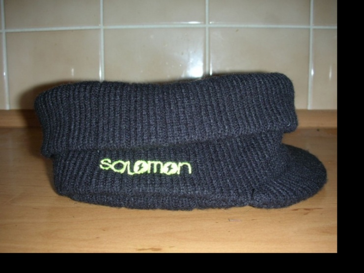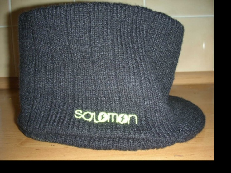 Černá čelenka se žlutým nápisem Salomon. Vpředu malý kšiltík. Lze ohrnout a přizpůsobit tak velikosti hlavy.