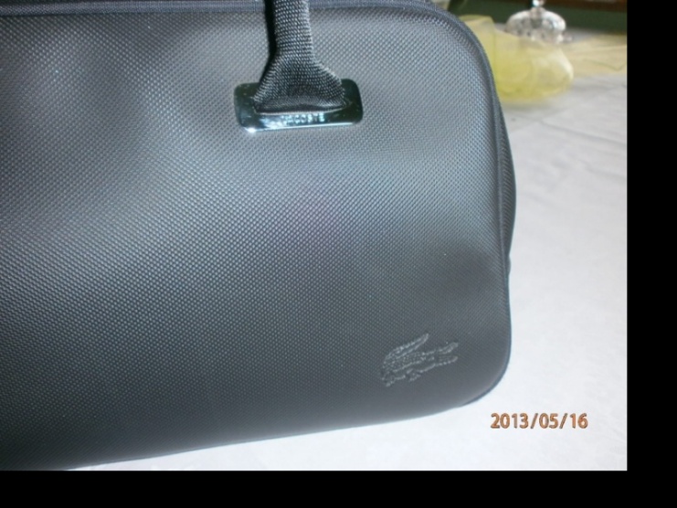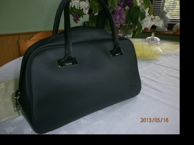 Kabelka je nenošená, materiál umělá koženka s jemným dezénem. Okolo upevnění uch jsou decentní stříbrné ozdoby s nápisem Lacoste a tento nápis je plasticky vyražen i na vnější straně kabelky. Vnitřek kabelky je vybaven šikovnými kapsičkami.