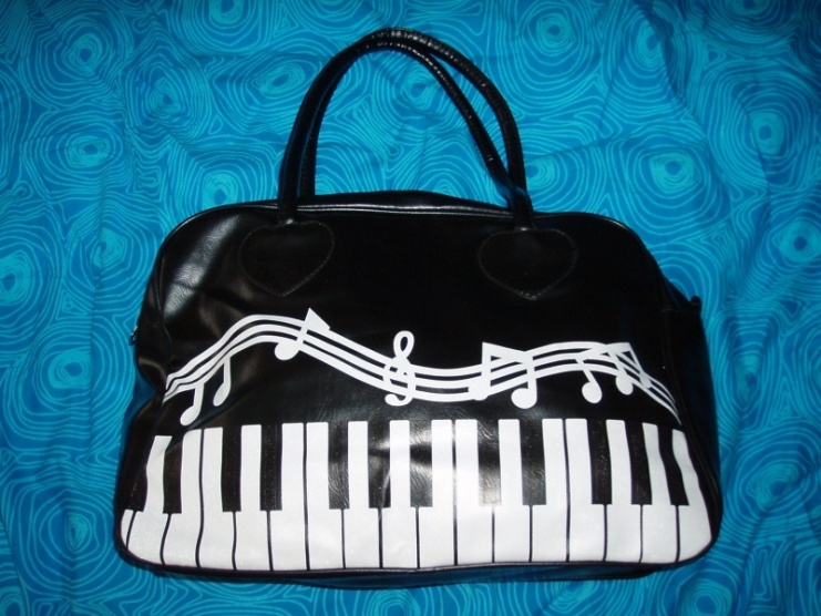 Úplně nová taška. Dostala jsem ji darem,ale nevyužiju ju,tak posílám dál. Rozměry 40x27x12 cm.Celočerná, na přední straně motiv klavíru a noty. Uvnitř velká kapsa na zip, dále malá kapsička na zip a na mobil.Vzadu další malá kapsična na zip.