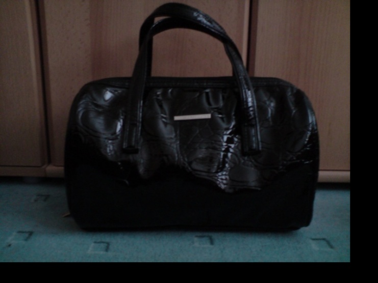 Kabelka je lesklá, černá a nová. Její výška je 20cm, šířka 12,5cm a délka 27cm. Má menší ucha proto je jen do ruky. Ve vnitřku kabelky jsou dvě velké průhledné kapsy jedna je na zip.