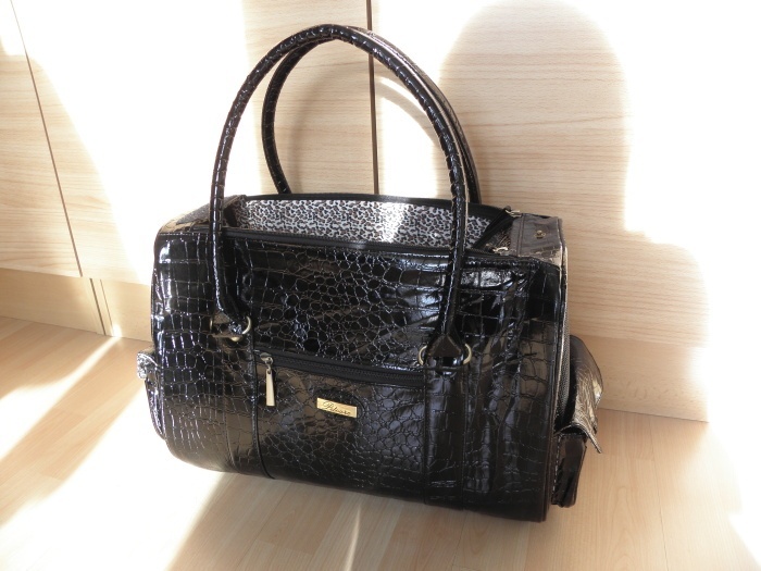Prodám černou lesklou kabelku imitace kůže-krokodýl. PC 3500,- ale nevyhovuje nám velikost, má dlouhé uši, lze nosit v ruce či na rameni. Horní část na dva zipy otevírací, na stranách a vpředu kapsičky. Uvnitř je vyndavací měkká podložka a poutko pro upevnění pejska k obojku. z boku dvě sítky pro viditelnost pejska.