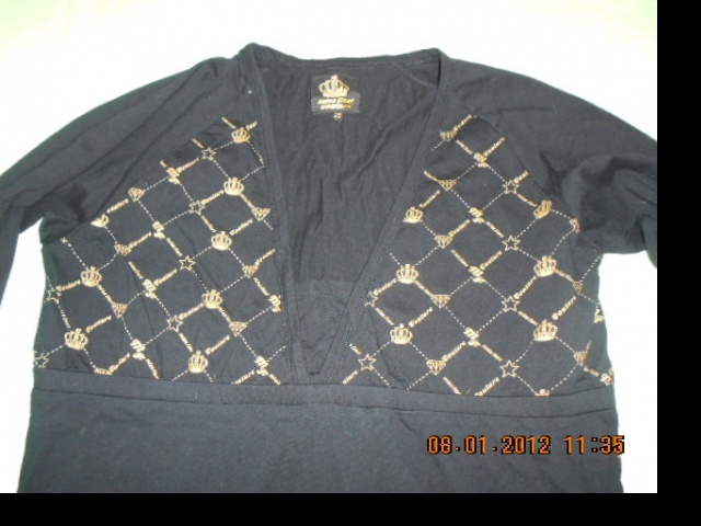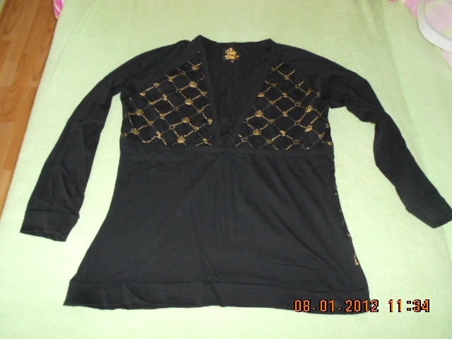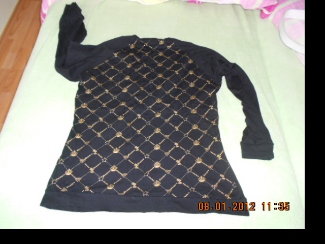 0Prodám krásnou mikinu Miss Fiori, nošená pouze párkrát. Barva je černá se zlatým potiskem, velice zajímavý střih, který zvýrazňuje postavu. Velikost je uvedena UK18 (naše 46).